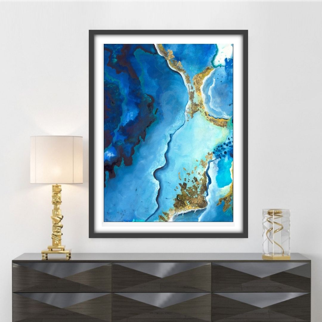 Translucent turquoise penetrates through deep Prussian blue, cobalt blue, phthaloyl blue, ultramarine blue, and cerulean blue meander together with scattered golden hues to awaken our consciousness