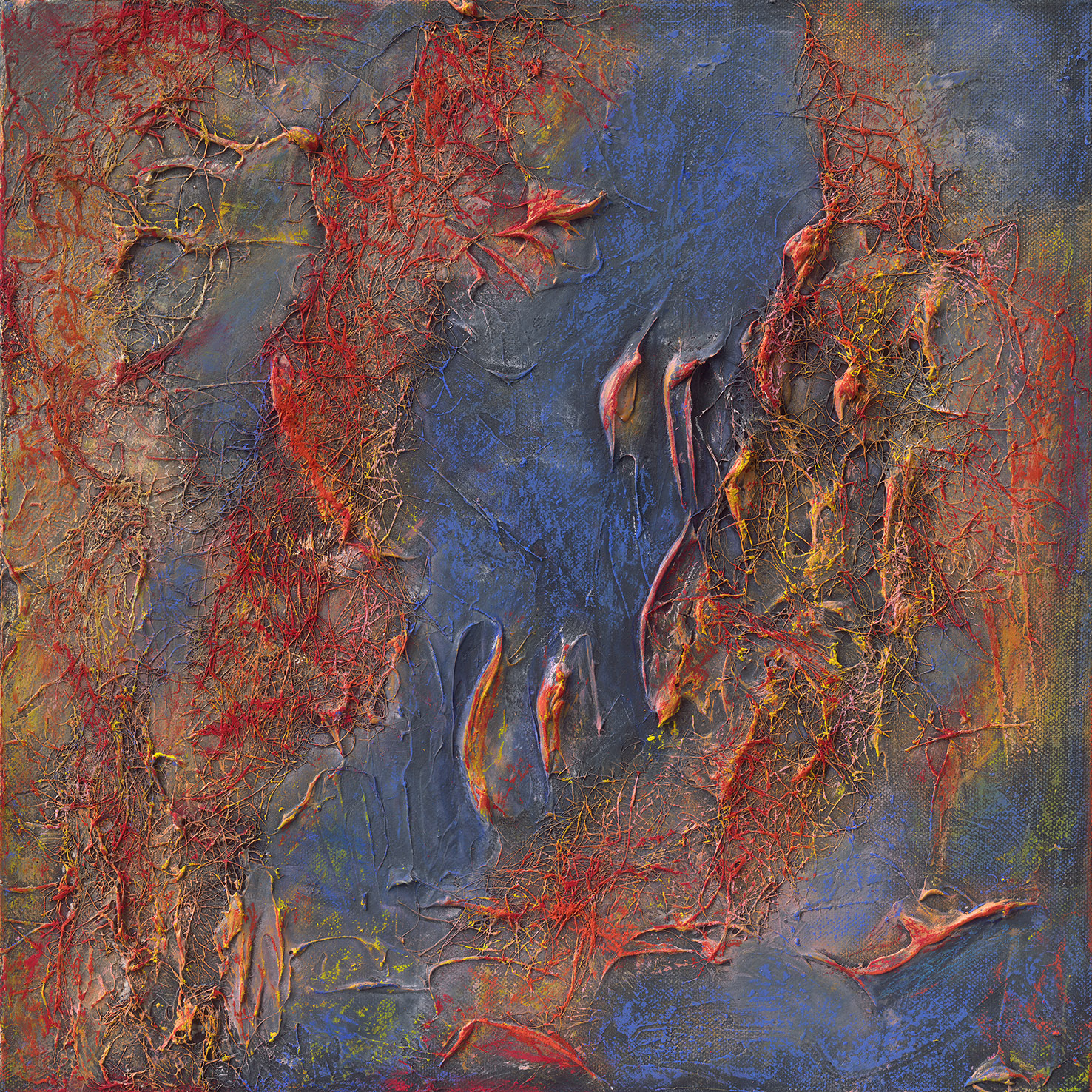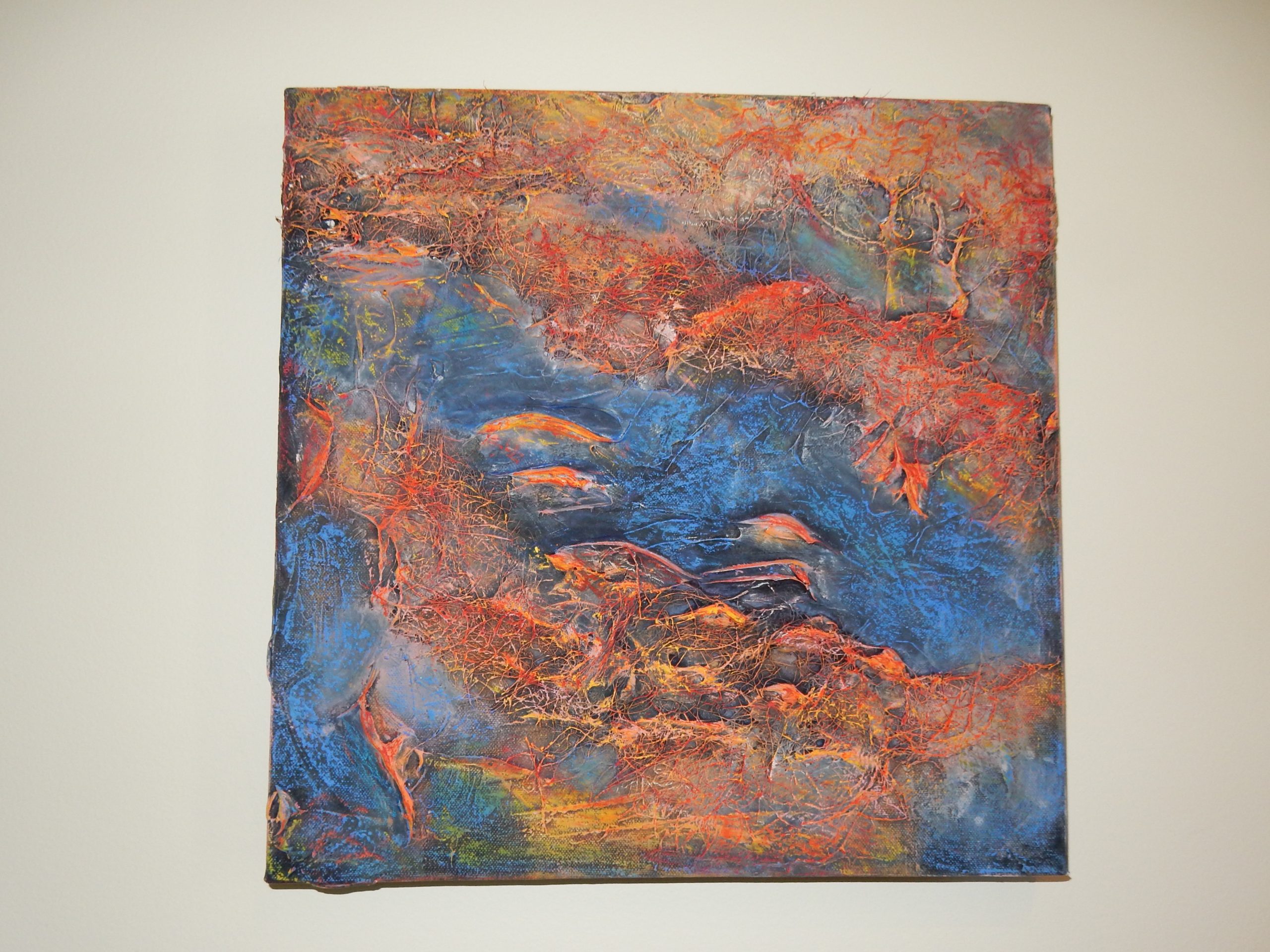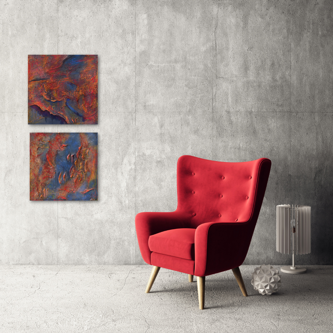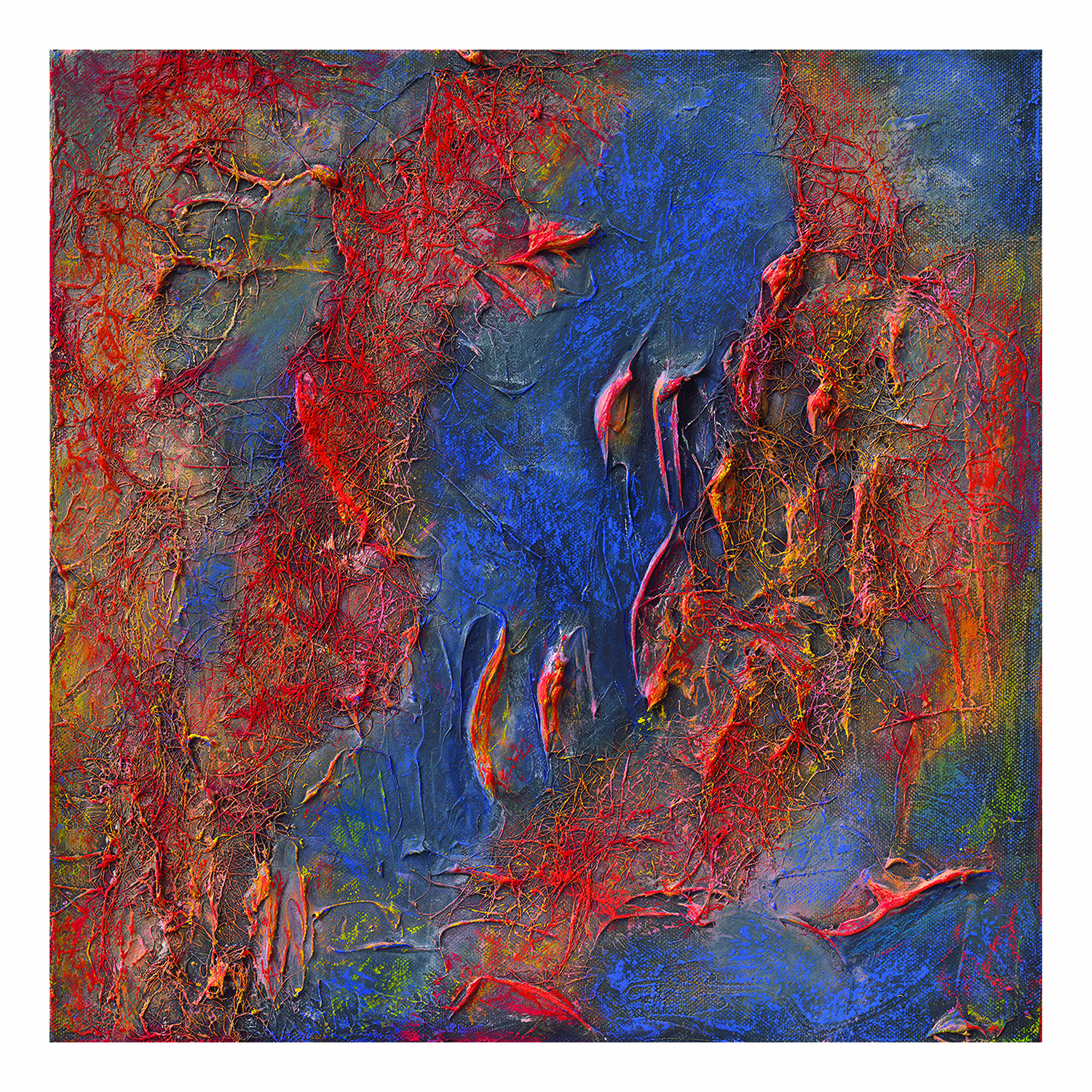 Painted while in Covid19 Isolation, In Iso’ I painted by Kate St James is a rugged woven landscape of the mind that depicts random interconnections in a web like canvas, where moments of cadmium yellow ignites the undercurrent weight of pthalio blue. With electric waves of colour in scarlet reds and tangerine, the landscape is connected across deep terrains. This metaphorically represents our abilities as artists to work in isolation, alone yet together with technology, which enables us to create complete synergy on canvas when there are 800 kilometres and Covid between us. The beauty of this psychological landscape is the fibrous layers that connect colour, texture and tone with a depth of fiels that makes you wonder if you are looking at the natural or imaginary world.