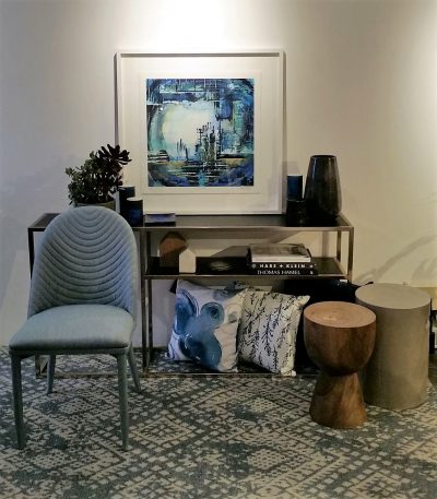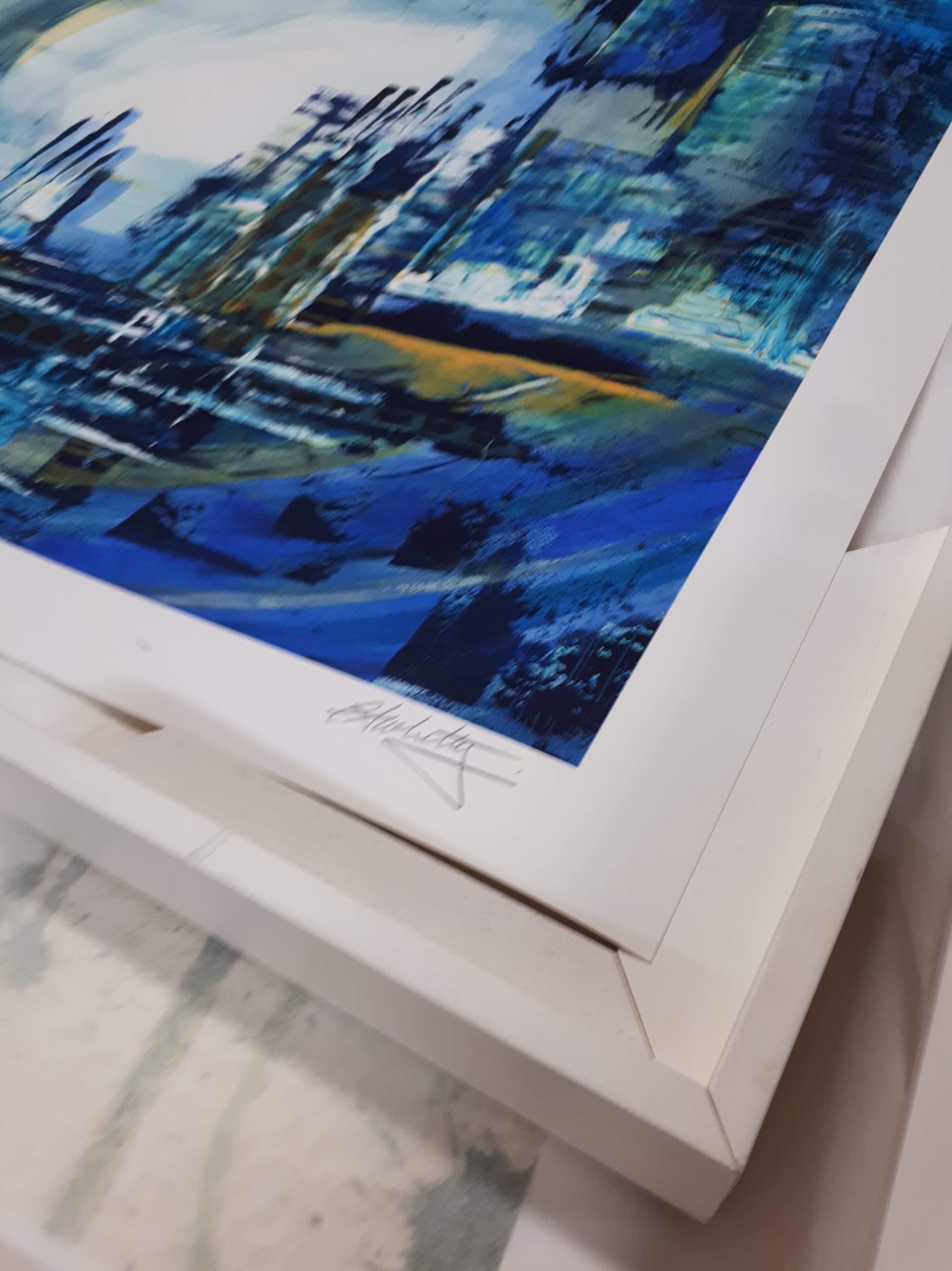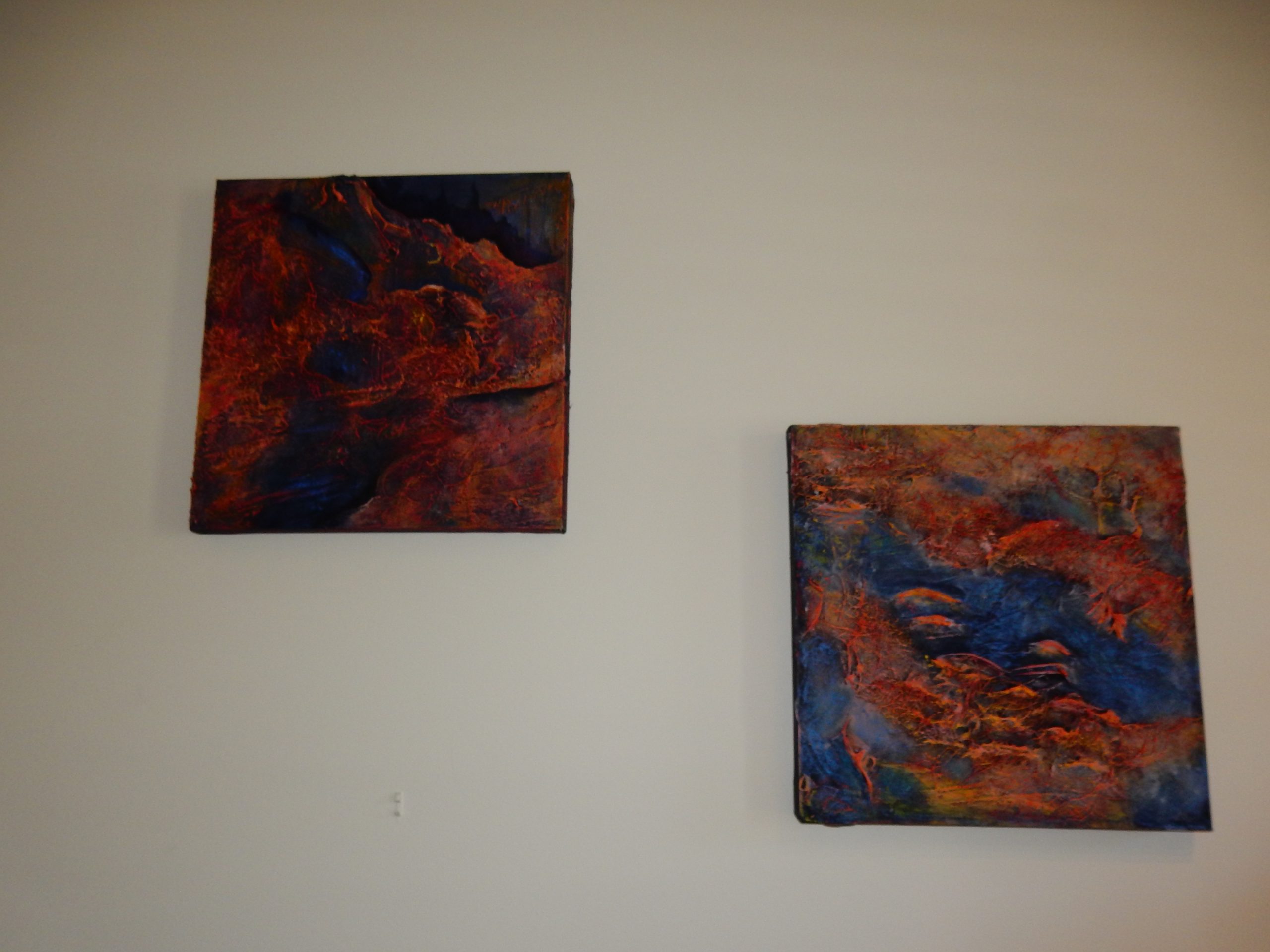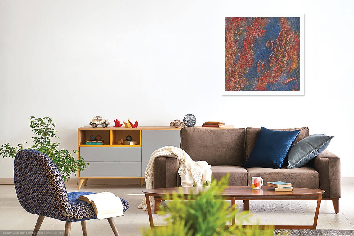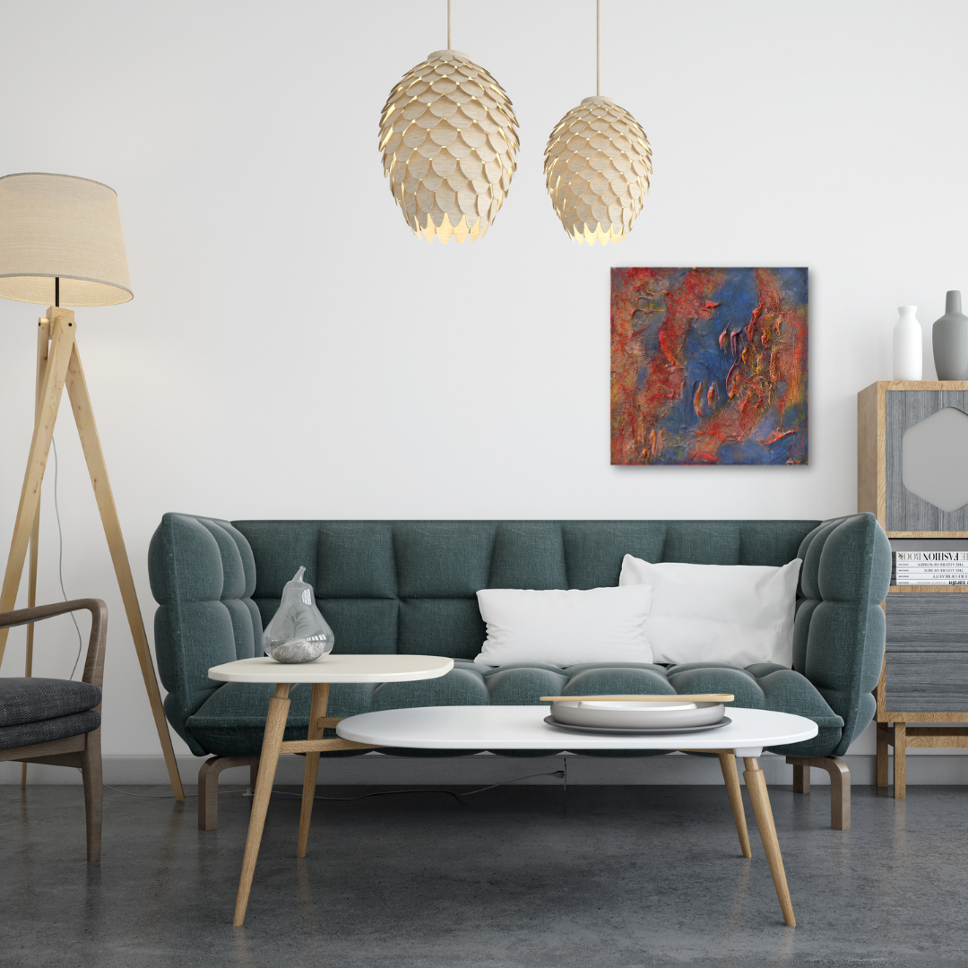 Painted while in Covid19 Isolation, In Iso’ I painted by Kate St James is a rugged woven landscape of the mind that depicts random interconnections in a web like canvas, where moments of cadmium yellow ignites the undercurrent weight of pthalio blue. With electric waves of colour in scarlet reds and tangerine, the landscape is connected across deep terrains. This metaphorically represents our abilities as artists to work in isolation, alone yet together with technology, which enables us to create complete synergy on canvas when there are 800 kilometres and Covid between us. The beauty of this psychological landscape is the fibrous layers that connect colour, texture and tone with a depth of fiels that makes you wonder if you are looking at the natural or imaginary world.