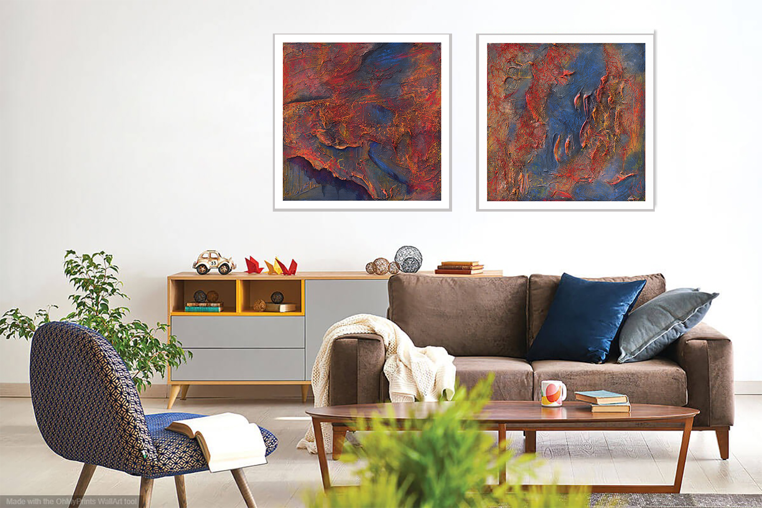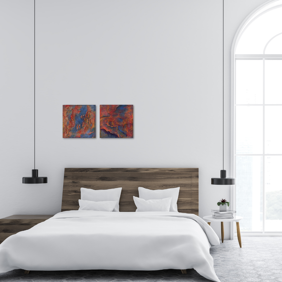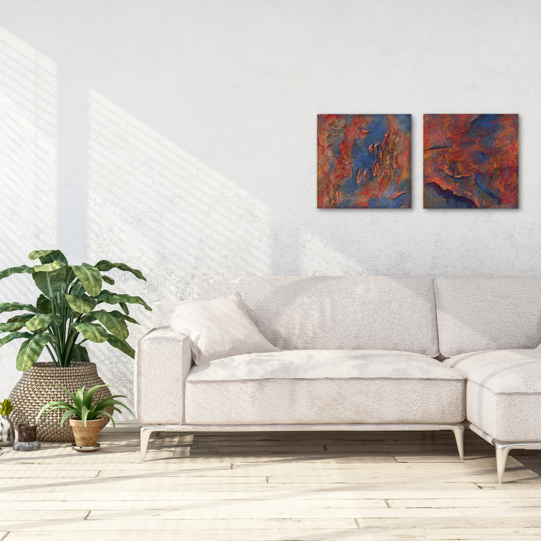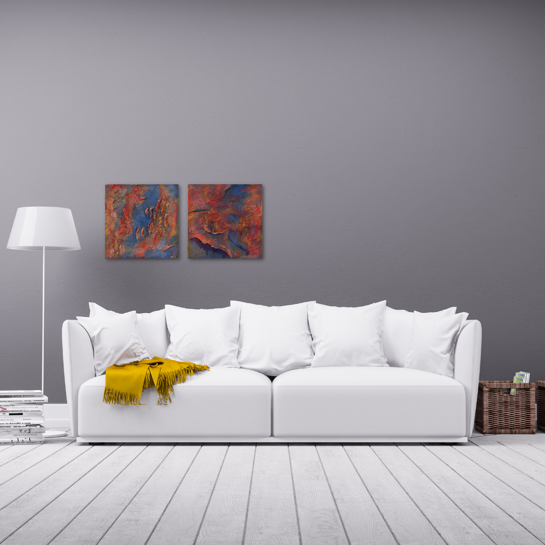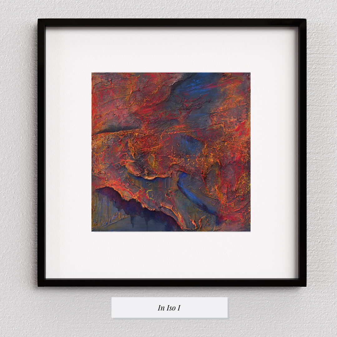 Painted while in Covid19 Isolation, In Iso’ II painted by Catherine Whitting is a rugged woven landscape of the mind that depicts random interconnections in a web like canvas, where moments of cadmium yellow ignites the undercurrent weight of pthalio blue. With electric waves of colour in scarlet reds and tangerine, the landscape is connected across deep terrains. This metaphorically represents our abilities as artists to work in isolation, alone yet together with technology, which enables us to create complete synergy on canvas when there are 800 kilometres and Covid between us. The beauty of this psychological landscape is the fibrous layers that connect colour, texture and tone with a depth of field that makes you wonder if you are looking at the natural or imaginary world.