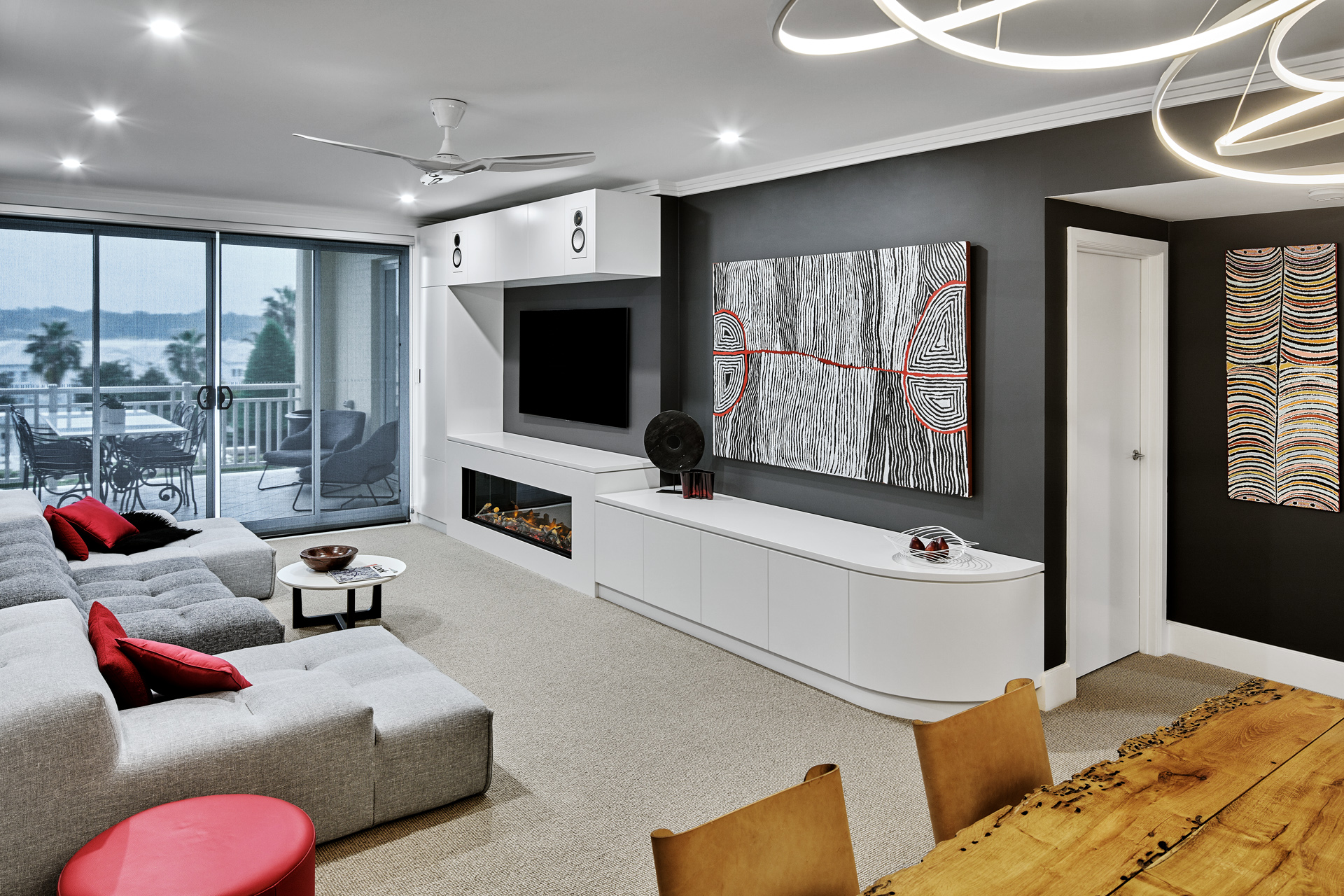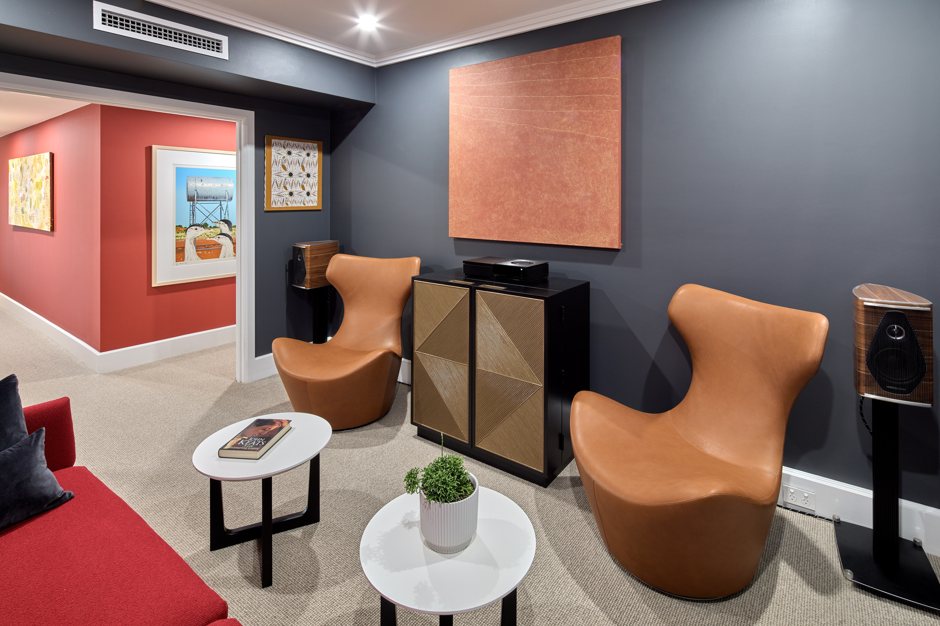Galleria Sanctum was designed around our client’s love of the Antarctic, classical music, and her treasured personal indigenous art collection. The once bland beige apartment was to be transformed into an immersive experience of colour, music and fine art that created a sanctuary to come home to. Working in detail with our client we worked collaboratively through the design concept, established mood boards, a materials and finishes colour palette, space planning, 3D modelling and design documentation prior to taking the project into construction. Colour was a pivotal part of the design process as is provided the conceptual tool to celebrate the art collection and identify the public and private spaces within the apartment.