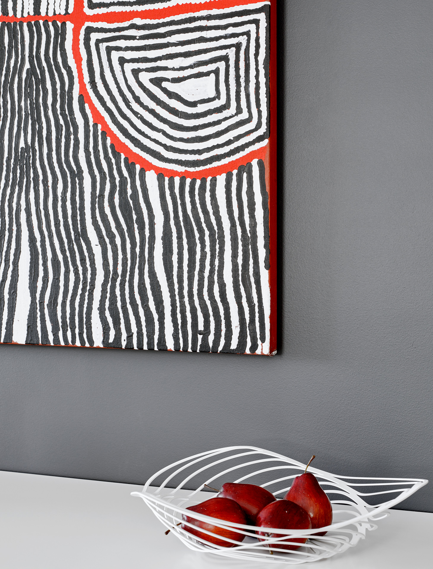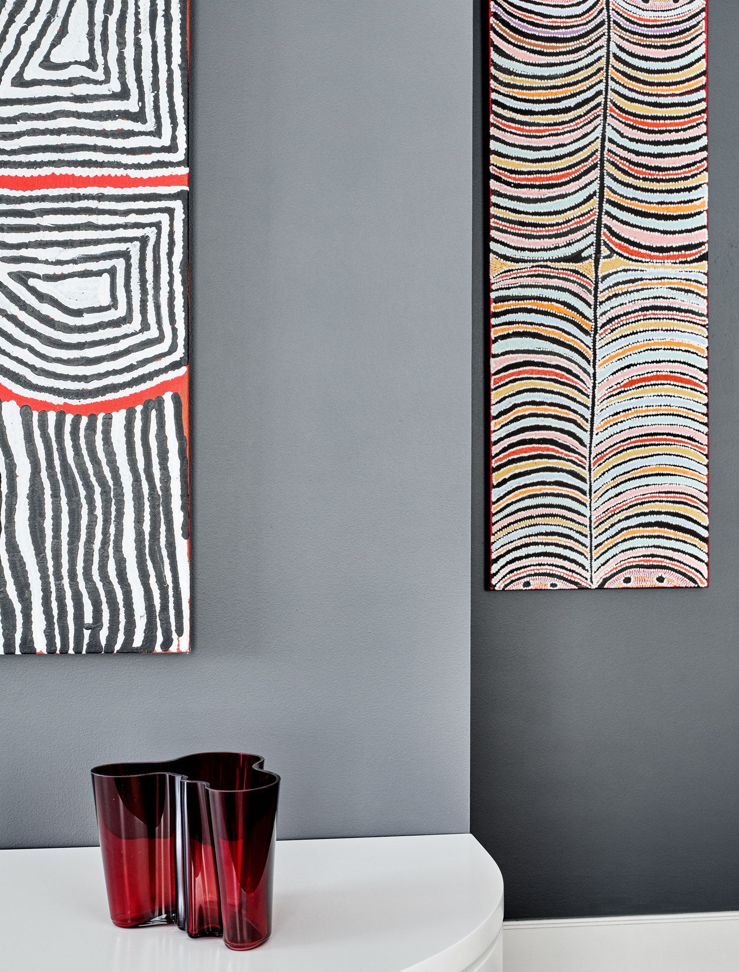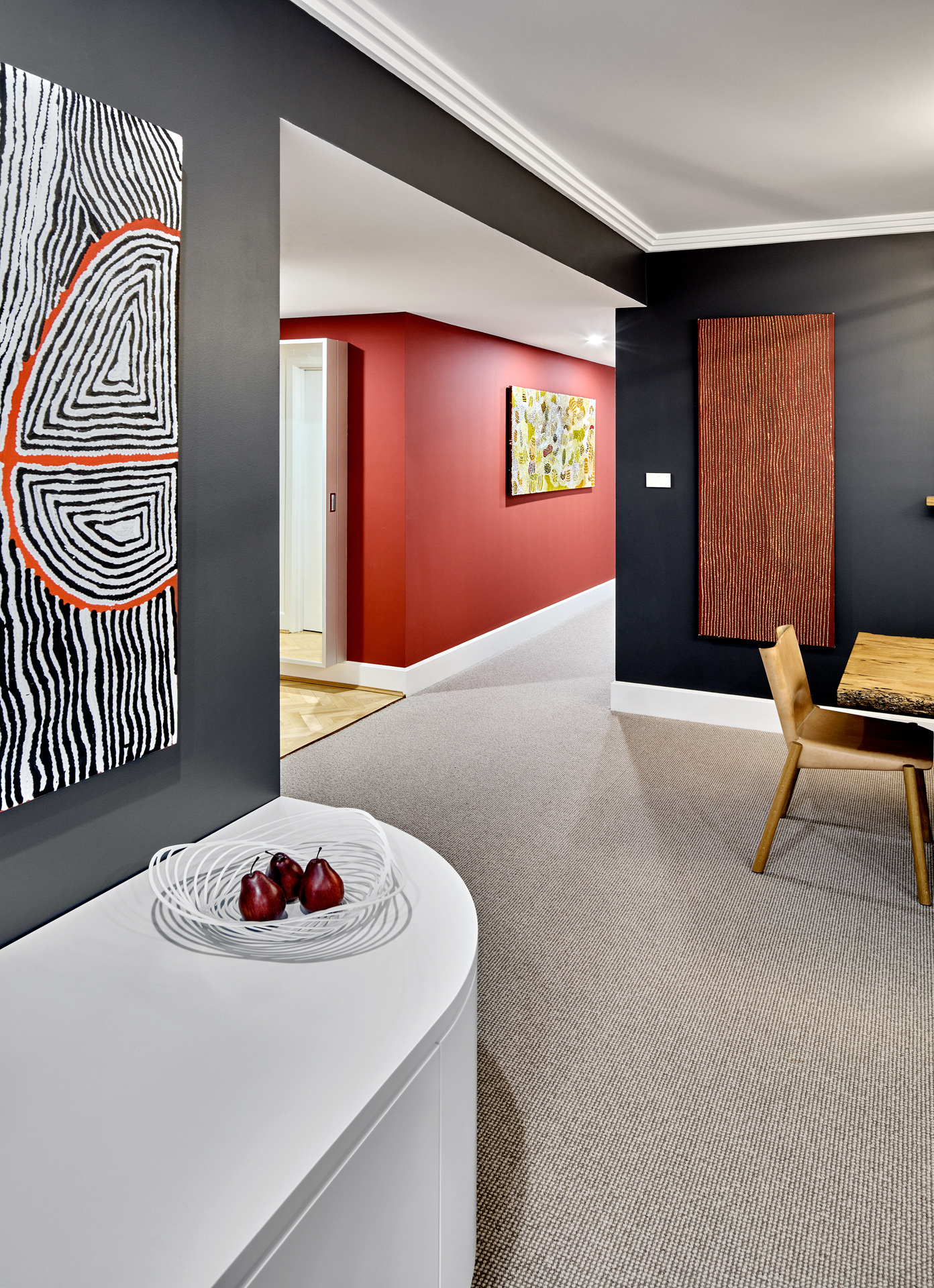 All public spaces, lounge dining and wine bar and custom made joinery were in St James Whitting Igneous and Resene Alabaster providing a classic analogous palette and also referencing her love of penguins in the Antarctic, whilst simultaneously providing the perfect gallery like wall to frame her indigenous art collection. The hallway was painted in rich Resene Lusty the exact background palette found in her original indigenous painting, from her private art collection and also provides the perfect warm and edible tones adjacent to the kitchen.