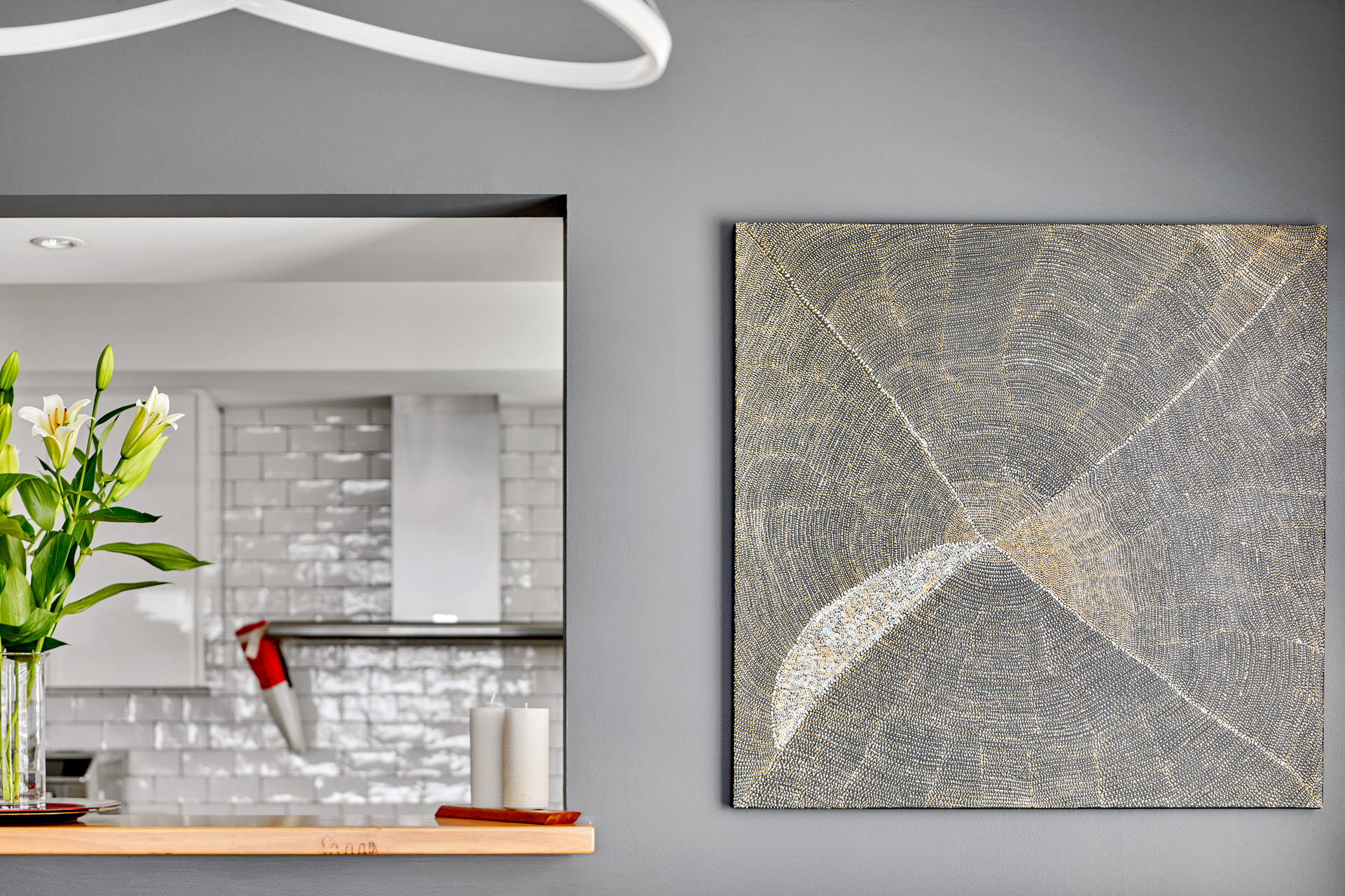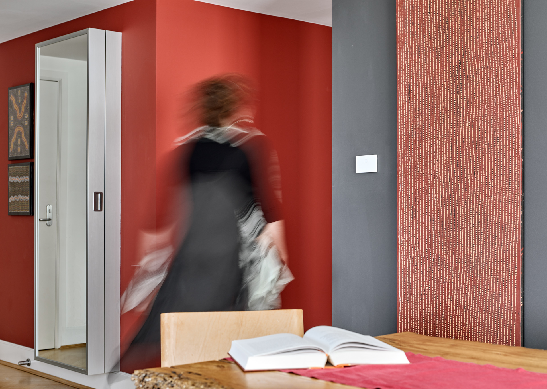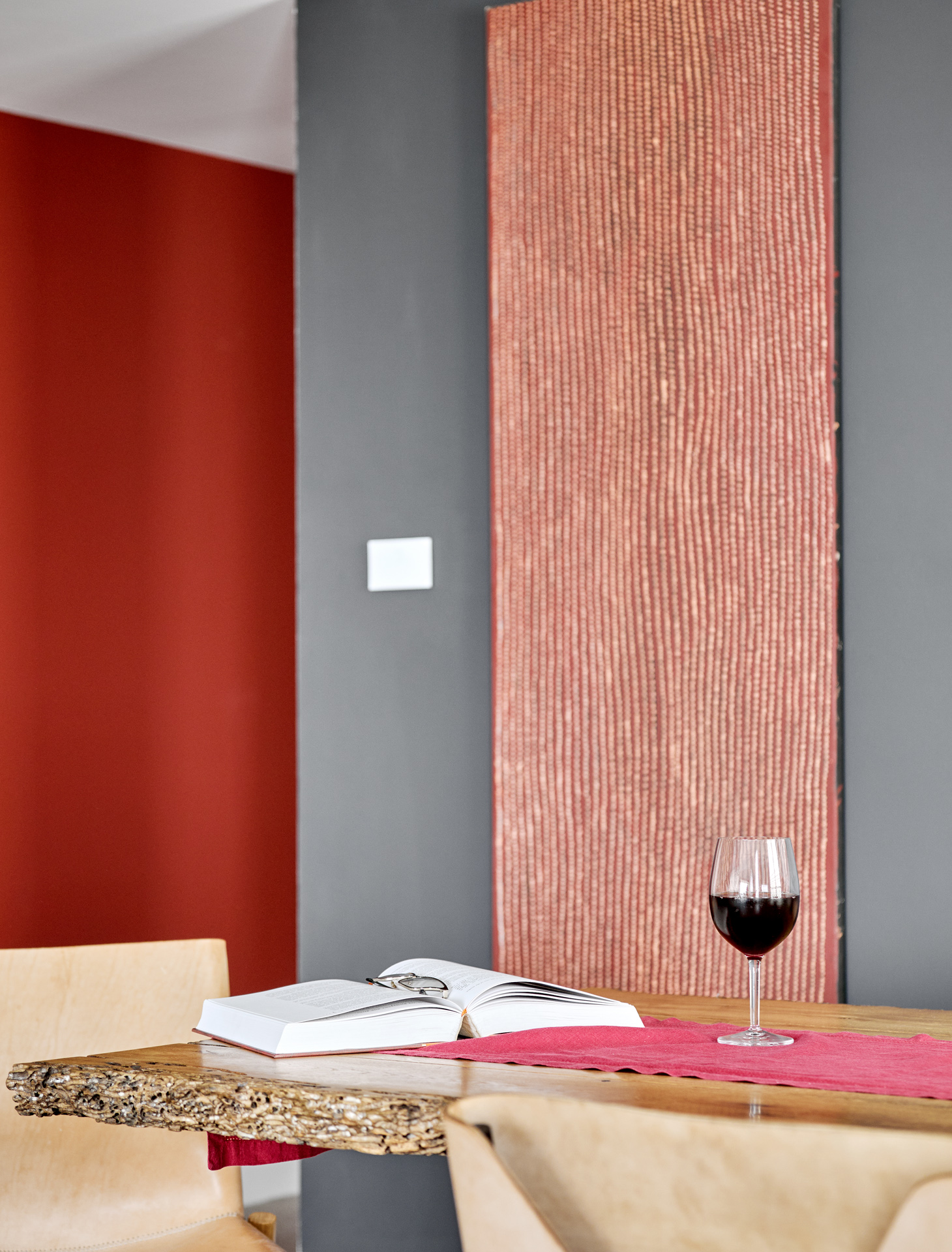 All public spaces, lounge dining and wine bar and custom made joinery were in St James Whitting Igneous and Resene Alabaster providing a classic analogous palette and also referencing her love of penguins in the Antarctic, whilst simultaneously providing the perfect gallery like wall to frame her indigenous art collection. The hallway was painted in rich Resene Lusty the exact background palette found in her original indigenous painting, from her private art collection and also provides the perfect warm and edible tones adjacent to the kitchen.