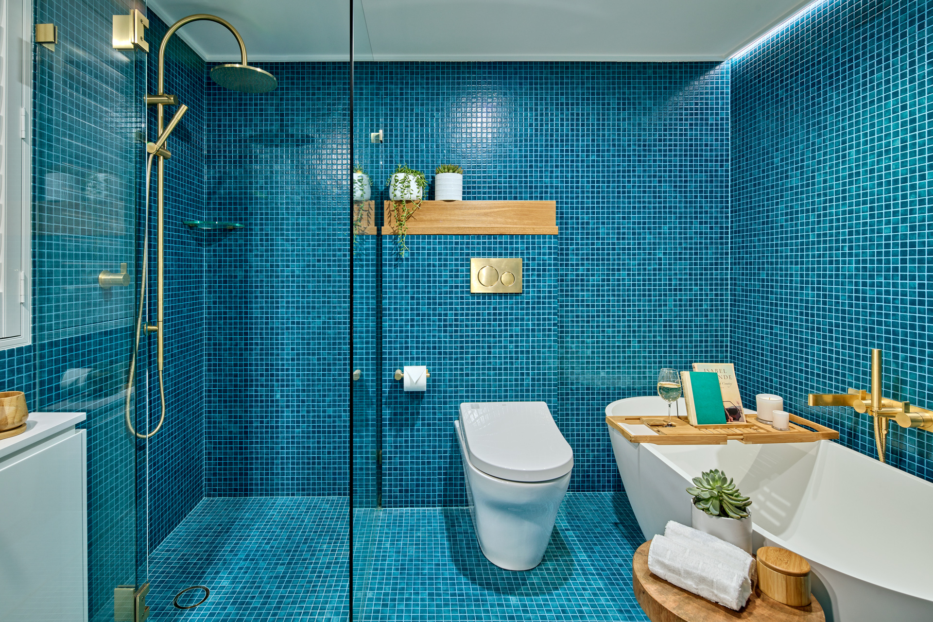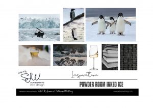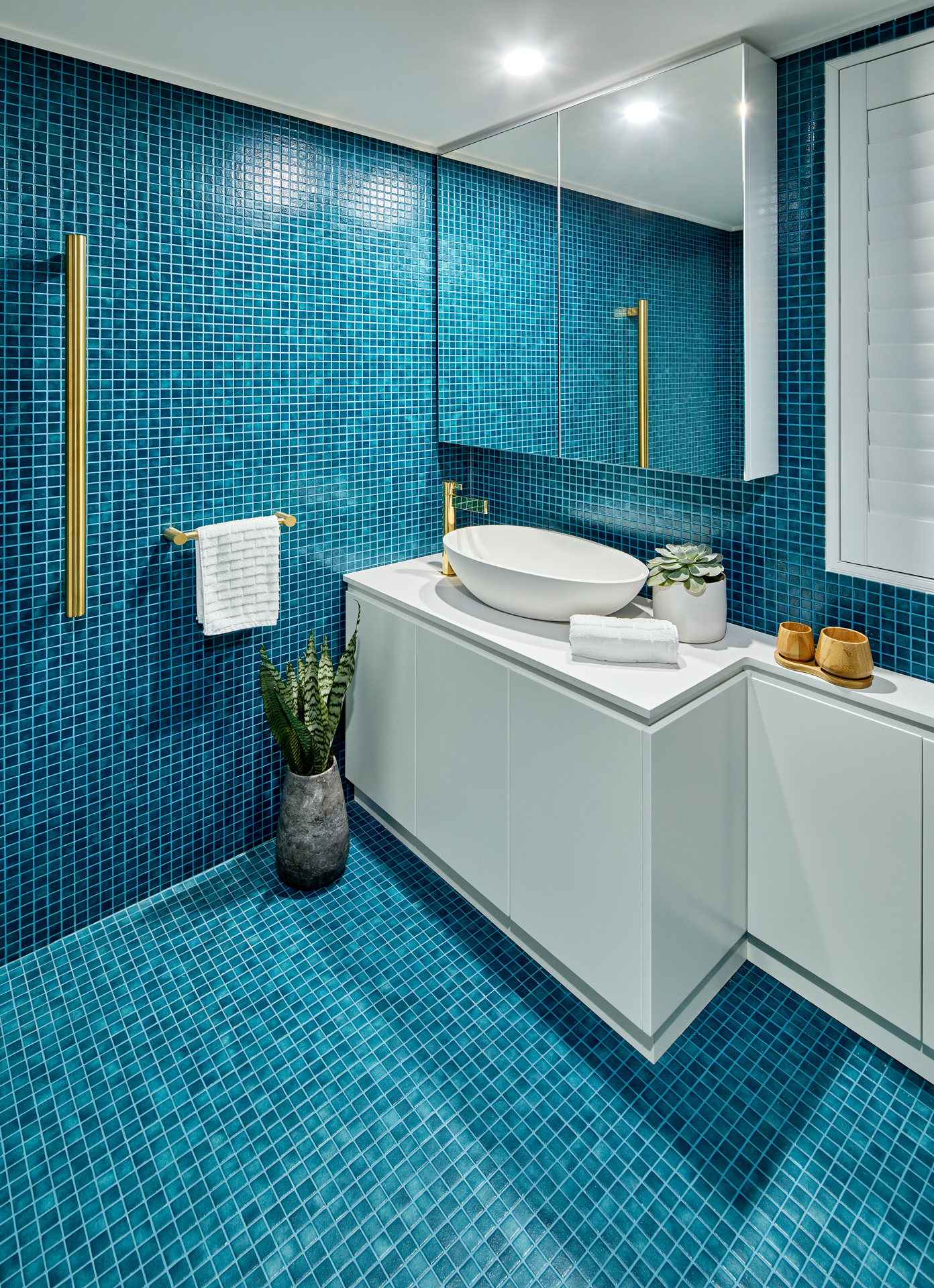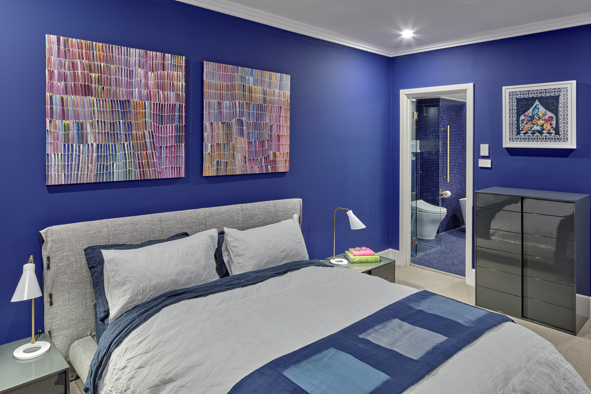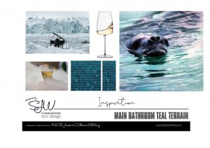 The master bedroom and ensuite were to be representative of ‘Yves Klein Blue’ in colour –inspired by her personal photography of icebergs in the Antarctic. Resene Kudos perfectly complementing the Ezzari mosaic tiles on the floor and walls of the ensuite and in a flat finish also makes the alabaster painted shutters and her colourful indigenous artworks and limited edition St James Whitting print “ Drift on” pop off the wall The guest bedroom and bathroom celebrate her love of teal in Resene Atomic. The colour , coordinates perfectly with the Tuscan Sunset wallpaper and was also inspired by her personal photography of seals amongst icebergs in the Antarctic and contemporary European architecture.