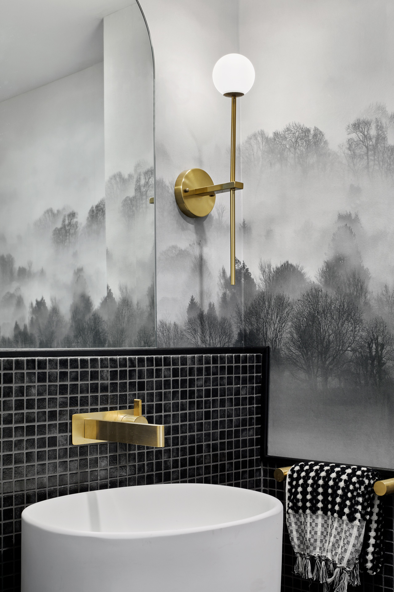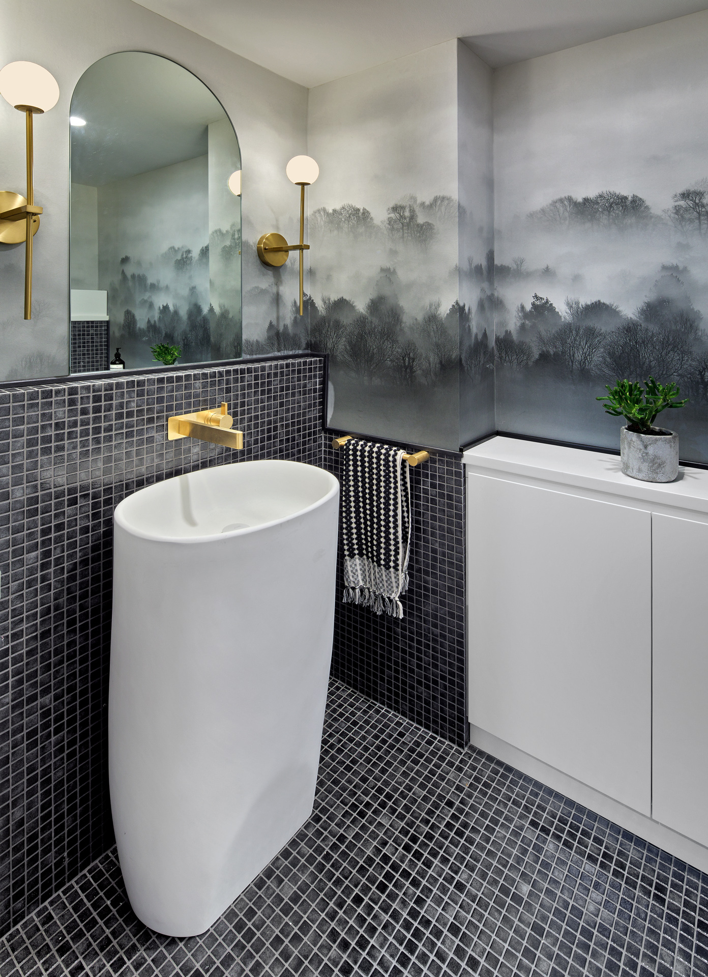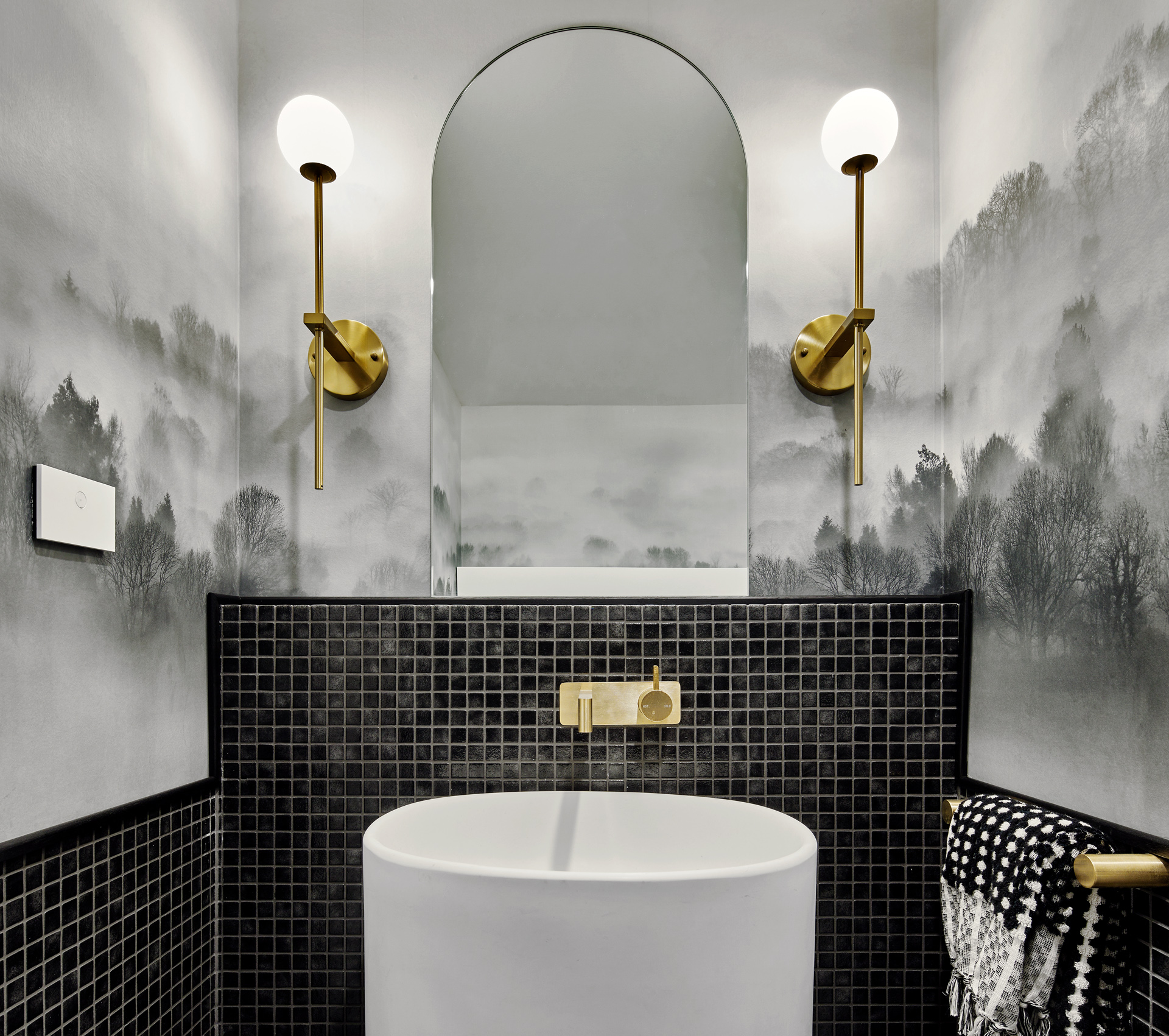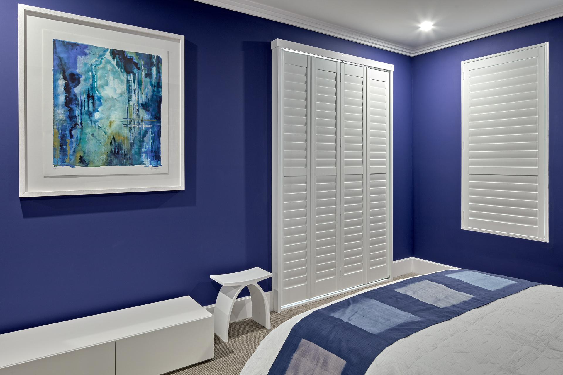 The master bedroom and ensuite were to be representative of ‘Yves Klein Blue’ in colour –inspired by her personal photography of icebergs in the Antarctic. Resene Kudos perfectly complementing the Ezzari mosaic tiles on the floor and walls of the ensuite and in a flat finish also makes the alabaster painted shutters and her colourful indigenous artworks and limited edition St James Whitting print “ Drift on” pop off the wall The guest bedroom and bathroom celebrate her love of teal in Resene Atomic. The colour , coordinates perfectly with the Tuscan Sunset wallpaper and was also inspired by her personal photography of seals amongst icebergs in the Antarctic and contemporary European architecture.