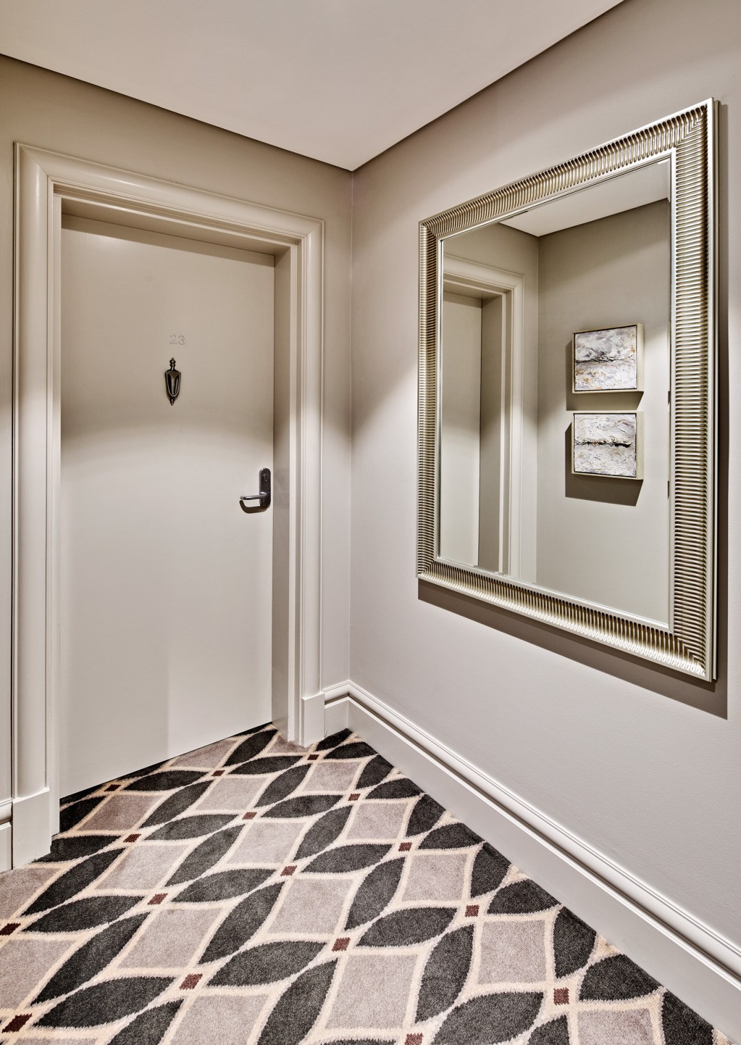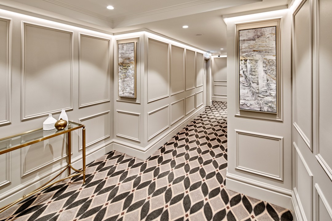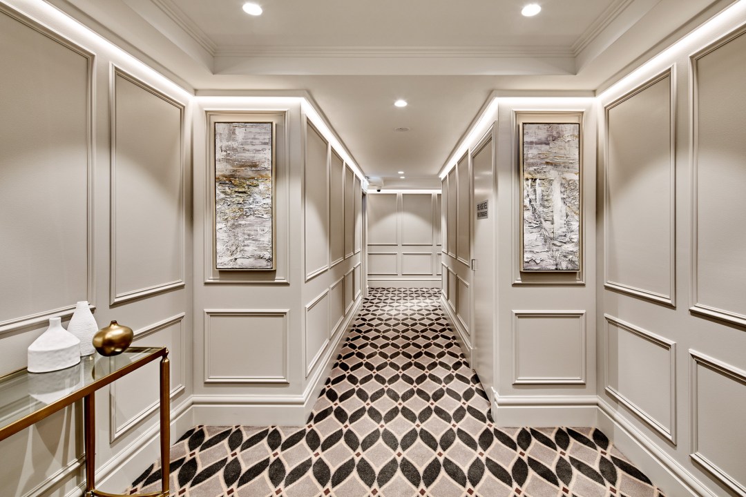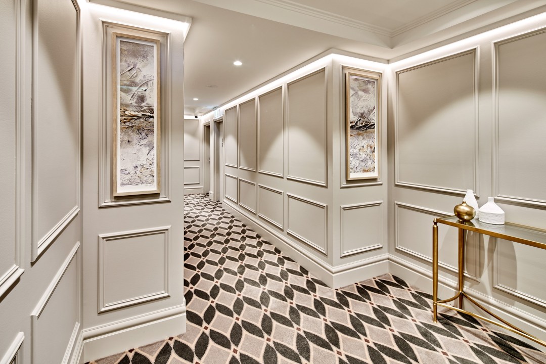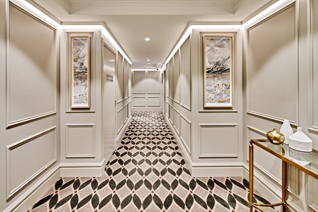 The custom carpet provided a link to the deep merlot tones of the parquetry detail in the thirty residences. Designed by St James Whitting and manufactured by Designer Rugs Foglia transformed the public foyers with a luxurious sense of arrival and international appeal. A fusion of New York and London sophistication with a touch of local inspiration.