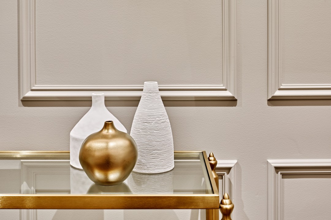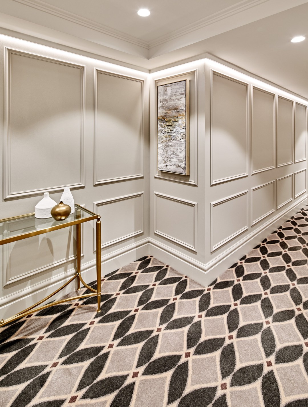 Wainscoting by Intrim mouldings was custom designed by SJW interiors to create a sense of height and luxury to the entrance level and painted in SJW Elementals Portobello coloured by Resene Paints,